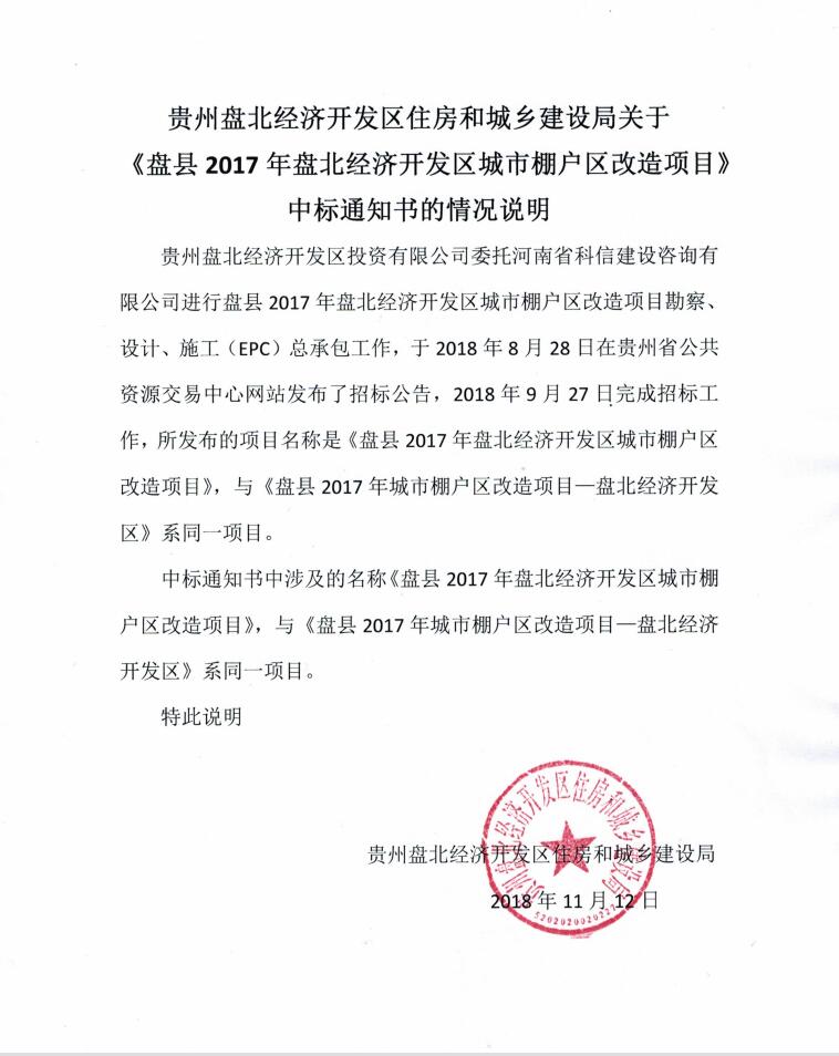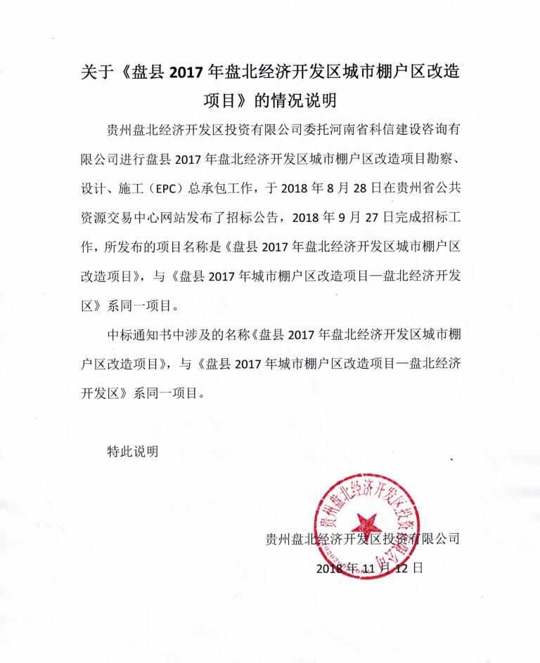 贵州盘北经济710公海赌赌船官网欢迎您关于《盘县2017年盘北经济710公海赌赌船官网欢迎您城市棚户区改造项目》中标通知书的情况说明