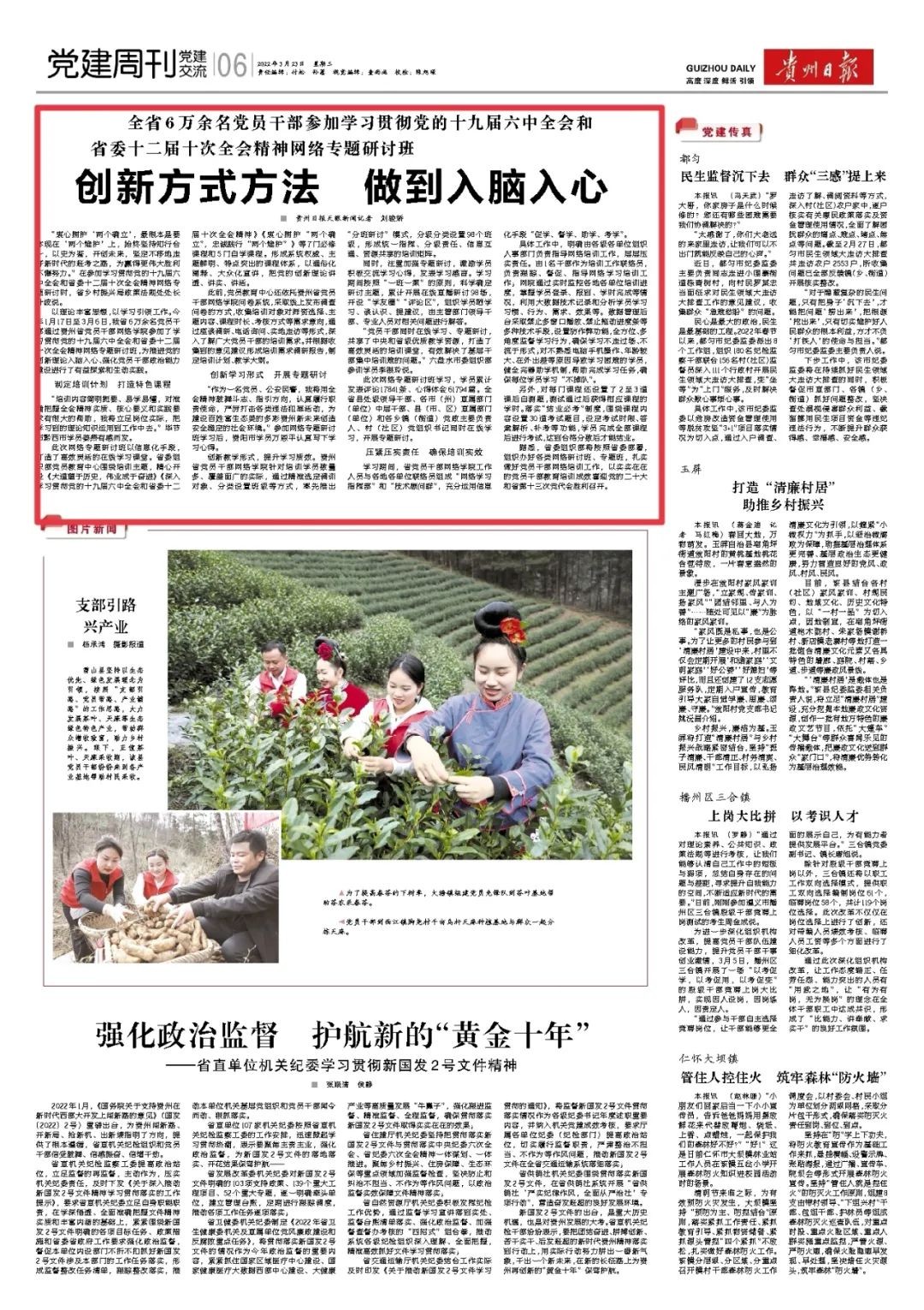 以理论丰富思想,以学习引领工作。今年1月17日至3月6日,我省6万余名党员干部通过贵州省党员干部网络学院参加了学习贯彻党的十九届六中全会和省委十二届十次全会精神网络专题研讨班,为推进党的创新理论入脑入心、强化党员干部政治能力建设进行了有益探索和生动实践。