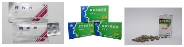(2)复方制剂:复方甘草(含)片,用于镇咳祛痰;阿桔片,用于镇咳祛痰;复方樟脑酊,用于治疗腹泻和干咳;复方甘草口服溶液,用于上呼吸道感染、支气管炎和感冒时所产生的咳嗽及咳痰不爽。